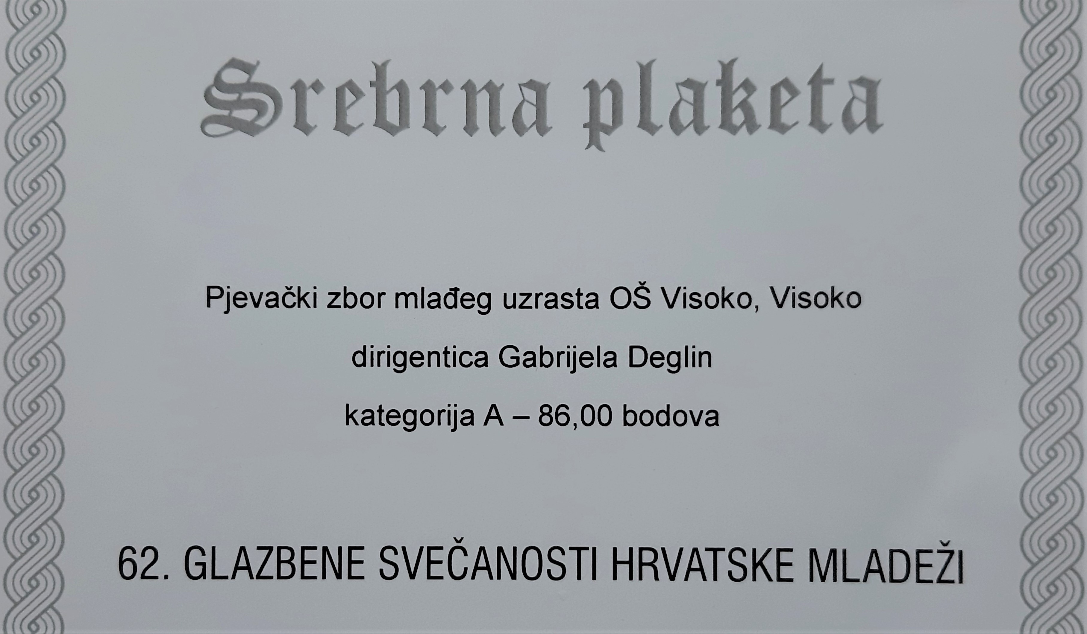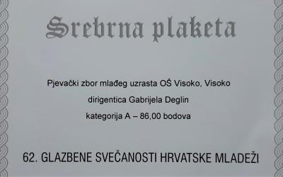 Na državnom natjecanju - 62. glazbenim svečanostima hrvatske mladeži, koje je trajalo dva dana, među 17 najboljih zborova u državi, naši pjevači još su napredovali i svojim nastupom osvojili 86,00 bodova što im je donijelo SREBRNU PLAKETU.