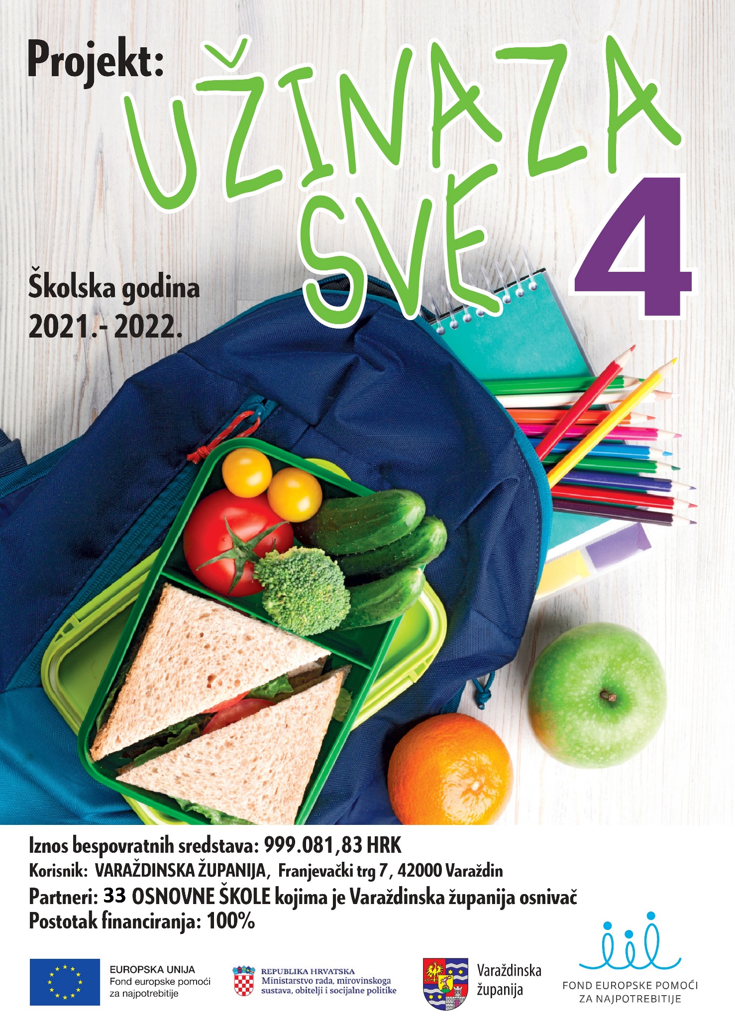 Cilj projekta „Užina za sve IV“ jest doprinijeti unaprjeđenju kvalitete života, smanjenju rizika od siromaštva i socijalne isključenosti, čime će se stvoriti pozitivno okruženje, doprinijeti boljem zdravstvenom stanju djece te kvalitetnijem praćenju nastavnih aktivnosti. Osigurat će se to kroz osiguravanje redovite i kvalitetne školske prehrane u osnovnim školama Varaždinske županije, za djecu koja žive u siromaštvu ili su u riziku od siromaštva.