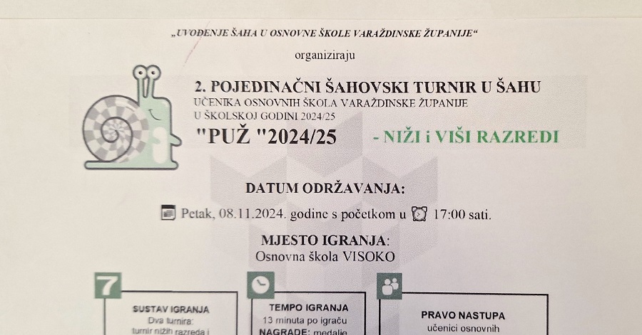 U petak, 8. studenoga s početkom u 17:00 sati u našoj školi održano je natjecanje učenika nižih i viših razreda osnovnih škola Varaždinske županije. Na 2. pojedinačnom turniru u šahu natjecala su se 74 natjecatelja, među njima i šest učenika iz naše škole koji su postigli lijepe rezultate.