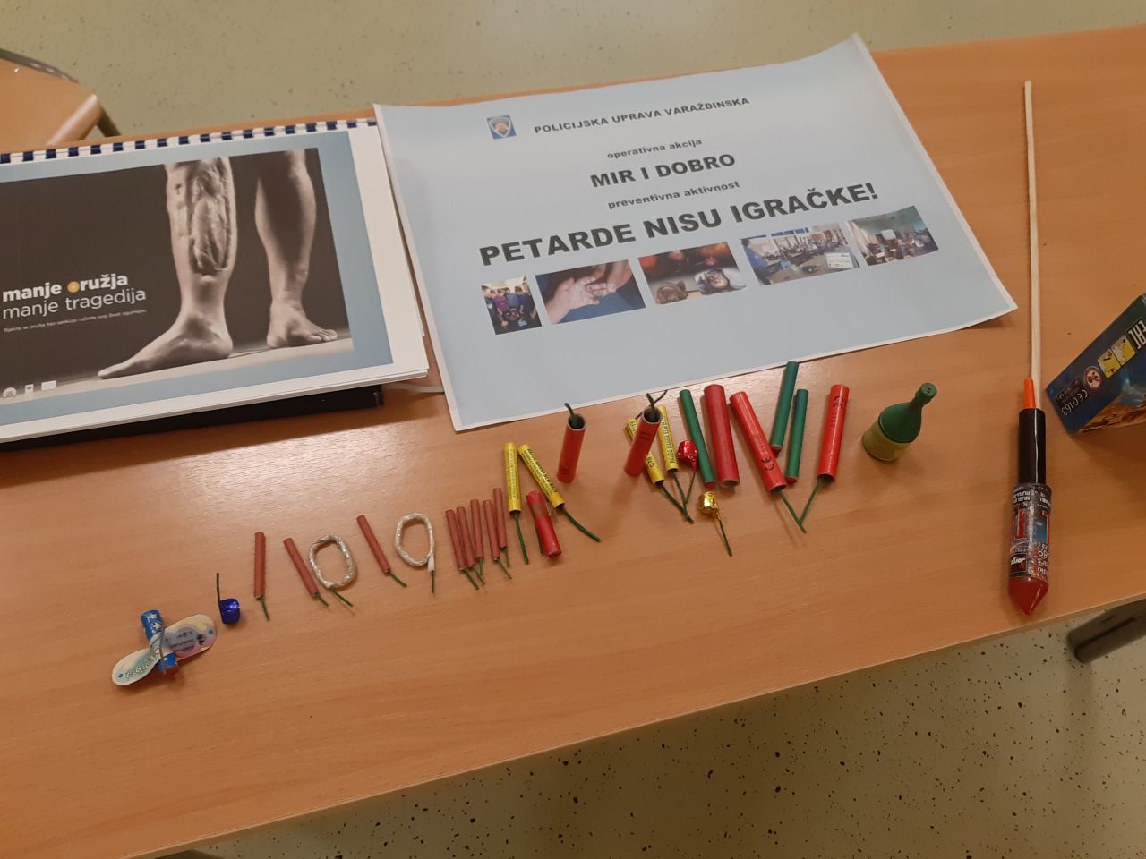 Vrijeme novogodišnjih blagdana predstavlja određen sigurnosni rizik, posebno za djecu i mlade, od ozljeđivanja zbog nestručnog rukovanja pirotehnikom. Zbog toga je u suradnji s Policijskom upravom Varaždinskom - ispostavom Novi Marof, održana radionica pod nazivom Petarde nisu igračke. Kroz prezentaciju i interaktivnu radionicu, učenicima osmog razreda i njihovim roditeljima, djelatnici policije ukazali su na česte posljedice nestručnog rukovanja pirotehnikom. Upravo su petarde čest uzročnik požara u podrumima, na balkonima, vozilima. No, na žalost, često posljedice nisu samo materijalne, već nestručno rukovanje pirotehnikom često ima za posljedicu vrlo ozbiljne ozljede šake, očiju, lica. Roditeljima je ukazano i na nezakonito korištenje pirotehnike, a samim time i na kazneno pravnu zaštitu djece. Djelatnici policije nisu propustili ukazati i na teške posljedice koje trpe životinje, posebno psi, kad se u njihovoj blizini koristi pirotehnika. Stoga je poruka svima: slavite pjesmom i druženjem, a ne eksplozivnim napravama!