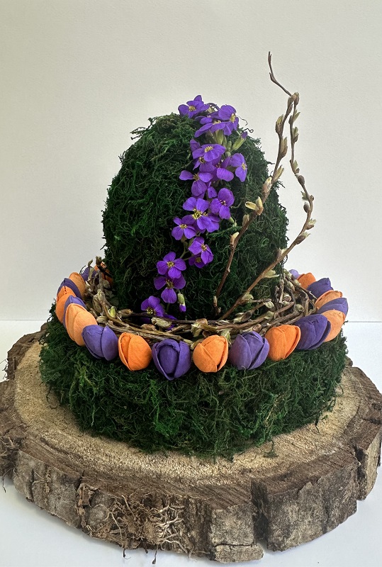 Izrada pisanice i ove je godine bila prilagođena senzornim specifičnostima učenice, izrađivana etapno, prema prethodnom modelu, demonstracijom svake etape od strane edukacijskog rehabilitatora. Pisanica je izrađena od gline. Svaka je etapa učenici prethodno demonstrirana i realizirana prema modelu odrasle osobe. Na glinu se nanosila mahovina pričvršćena za pisanicu tankim koncem. Na pisanicu su naknadno dodani cvjetovi ljubičaste boje u skladu s ovogodišnjom temom natjecanja „Proljeće u ljubičastom“. Na podlogu koja predstavlja cvjetni vrt u proljeće također se nanosila mahovina. Pisanica je okružena tulipanima u tonovima ljubičaste i narančaste boje, izrađenih od ljuski pistacije. Stabljike tulipana su također prirodni materijal. Gornji dio podloge cvjetnog vrta ispunjen je grančicama vrbe.