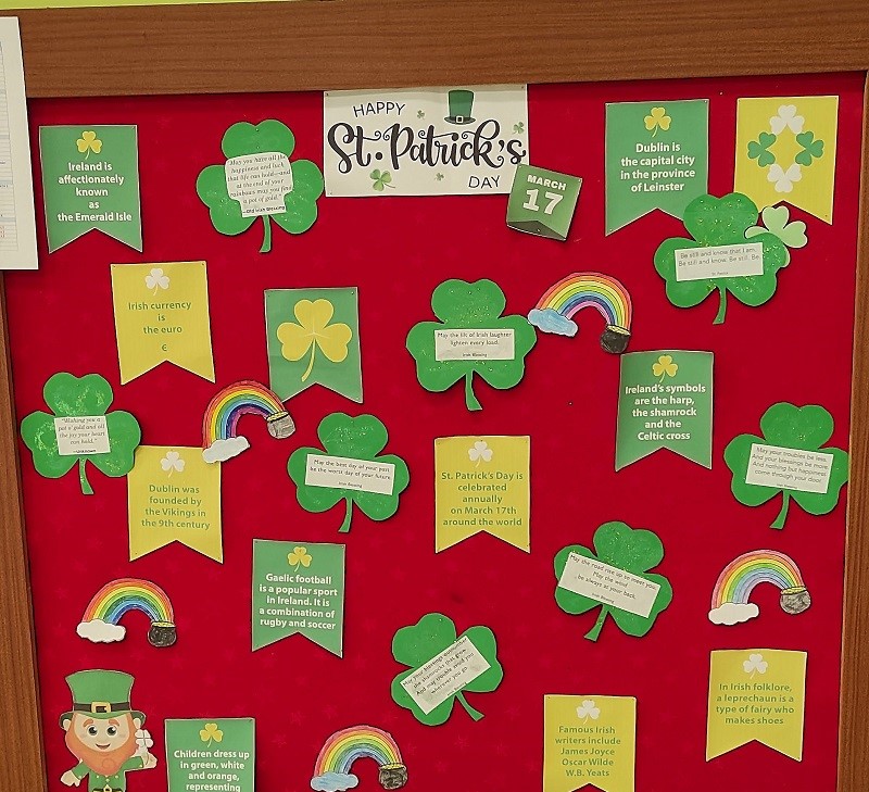 Polaznice eTwinning grupe donijele su dašak Irske i u našu školu ukrašavanjem panoa, a obilježavanje smo upotpunili potragom za najpoznatijim simbolom - djetelinom. Svaki učenik koji je pronašao djetelinu dobio je slatku nagradu. Na satovima engleskog jezika  učili smo o životu Sv Patrika, te simbolima i tradiciji ovoga dana.